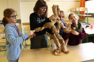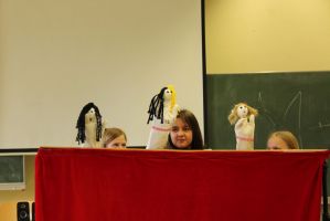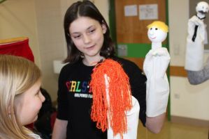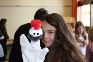 Professionell angeleitet und betreut wurden sie dabei von der freischaffenden Künstlerin und Leiterin des Theaters Moment in Grieskirchen Ruth Humer. Zunächst erlernten die Schülerinnen einige Grundsätze des Figurentheaterspiels beim Spiel mit der bloßen Hand. Anschließend wurden eigene Handpuppen gebastelt. Mit einfachen Materialien kreierten die Kinder ihre ganz persönliche Figur. Mit kleinen, selbst erfundenen Geschichten wurden sodann die Spielmöglichkeiten mit den Puppen ausgelotet. Am Nachmittag wurde mit alltäglichen Dingen experimentiert. Aus Malerkrepp wurde „Paperman“ und Abdeckfolien wurden zu fliegenden Monstern.