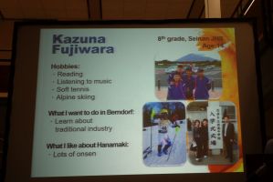 Nach einem Tag zum Eingewöhnen gab es am Mittwoch den schon traditionellen Festakt in der Aula. Dabei stellten sich alle Gäste mit ihren besonderen Interessen und Hobbies vor, präsentierten Interessantes aus ihrer Heimatpräfektur Iwate (mit der Hauptstadt Morioka), und es wurden Gastgeschenke ausgetauscht. Das musikalische Rahmenprogramm war eine Mischung aus internationalen Stücken und österreichischer Volkskultur.