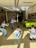 ... bei der Station „Märchen mampfen", bei der den Kindern aus Märchenbüchern vorgelesen wurde und sie aufmerksam zuhören mussten, um Fragen zum Inhalt zu beantworten. Die Kinder wurden anschließend mit Obst und Weihnachtsleckereien belohnt. Auch die Bewegung kam bei den Märchen-Stationen „Sportliche Märchen“ und “Pantomime” nicht zu kurz. Die Doppelstunde bereitete allen Beteiligten viel Spaß.