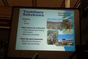 .... verschiedenen Junior High Schools aus ganz Hanamaki besuchte uns unter der Leitung von Frau Prof. Kimiko Segawa. Von der Oohasama High School, mit der wir schon seit 1997 regelmäßig in Kontakt sind, kam unter der Leitung von Herrn Vizedirektor Yoshiharu Sukekawa eine Oberstufendelegation aus einer Schülerin und einem Schüler. (Anmerkung: Manche unserer japanischen Freunde schlagen die Schreibweise Oohasama mit doppeltem O vor.)