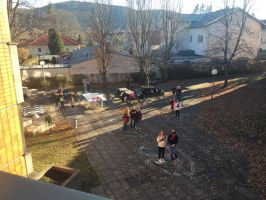 Um dieses Thema besser zu verstehen, nutzten dieSchülerinnen und Schüler den Schulhof und veranschaulichten dieses mit Hilfe von Straßenmalkreiden: So zeichneten sie auf dem Schulhof mit farbiger Kreide das Herz-Kreislauf-System des Menschen auf. Auf spielerische Weise wird so noch einmal den Unterrichtsstoff gefestigt, u.a. konnten sie die Wege des Blutes im Kreislauf nachlaufen.