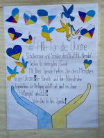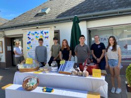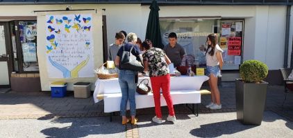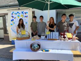 Mit einem Plakat, das die 3ER-Klasse gemeinsam entworfen und gestaltet hat, haben wir dann endlich Anfang Juni, nachdem uns der Wettergott endlich hold war, die selbstgemachten Köstlichkeiten gegen freie Spenden anbieten können. Insgesamt haben die Schülerinnen und Schüler 989,20 Euro beim Schulfest an das Jugend-Rotkreuz übergeben.