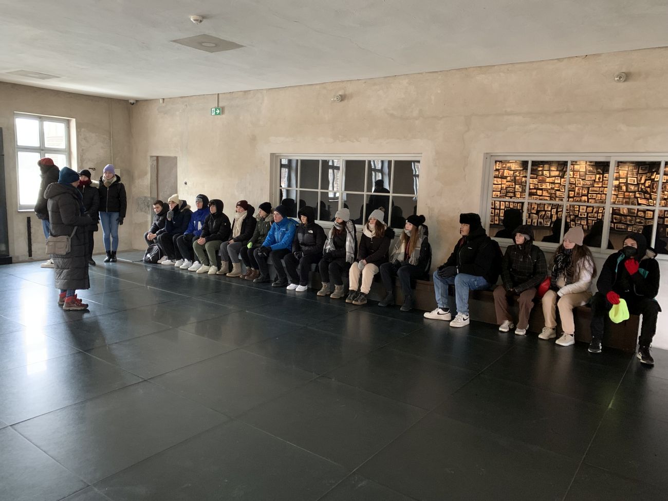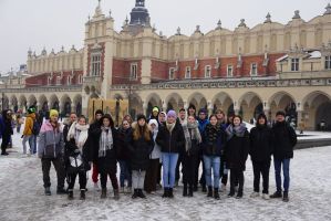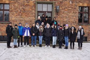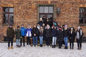 Im sogenannten Stammlager „Auschwitz 1“ hat uns vor allem der Block 11 mit seinem Keller, der „Schwarzen Wand“, den Dunkel- und Stehzellen beeindruckt. Der Block 11 ist auch jener Ort, an dem die ersten, probeweisen Vergasungen stattfanden. Darüber hinaus waren wir im Krematorium 1, dessen Leichenhalle später zur ersten Gaskammer umfunktioniert wurde. Nicht zuletzt war uns der Besuch im Block 17 wichtig, wo sich die österreichische Länderausstellung mit zahlreichen Exponaten befindet. Vor dem Block 17 haben wir - nach langem, gedanklichen Ringen - uns dazu entschieden, ein Gruppenfoto zu machen: es war uns wichtig, diesen Ort nicht als eine Art Touristenattraktion zu inszenieren, dementsprechend haben wir auf dem Foto bewusst auf das Lachen verzichtet. In Birkenau wurde uns durch die Besichtigung der Rampe und der gesprengten Krematorien das ganze Ausmaß der Vernichtung bewusst. In der „Sauna“ haben die Opfer durch die Fotoausstellung ein Gesicht bekommen. Die Bildgalerie ist ein wichtiger Abschnitt im Lager, denn mithilfe der Fotos aus glücklichen Tagen der Opfer bekommen diese ein Gesicht und werden aus der Abstraktion kaum greifbarer Zahlen geholt. Verstärkt wurde unser Eindruck von der kontinentalen Kälte: unvorstellbar erschienen uns stundenlange Appelle und ganz grundsätzlich ein Überleben mit Holzpantoffeln und einem Fetzen Stoff unter diesen Bedingungen.