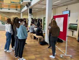 In Gruppenarbeiten wurden die diversen Medien gewählt, besprochen und aus allen Blickwinkeln beleuchtet. Zu den Ergebnissen wurden Plakate - bewusst auch die Offline Welt hier einbezogen - gestaltet und in einer kleinen „Ausstellungsmesse des Wissen“ im Schulgebäude den anderen Gruppen vorgestellt.