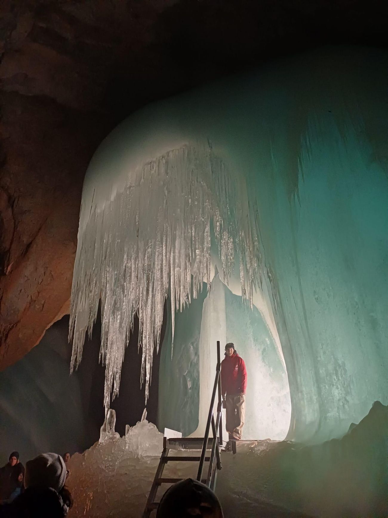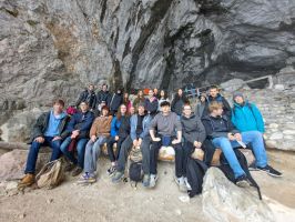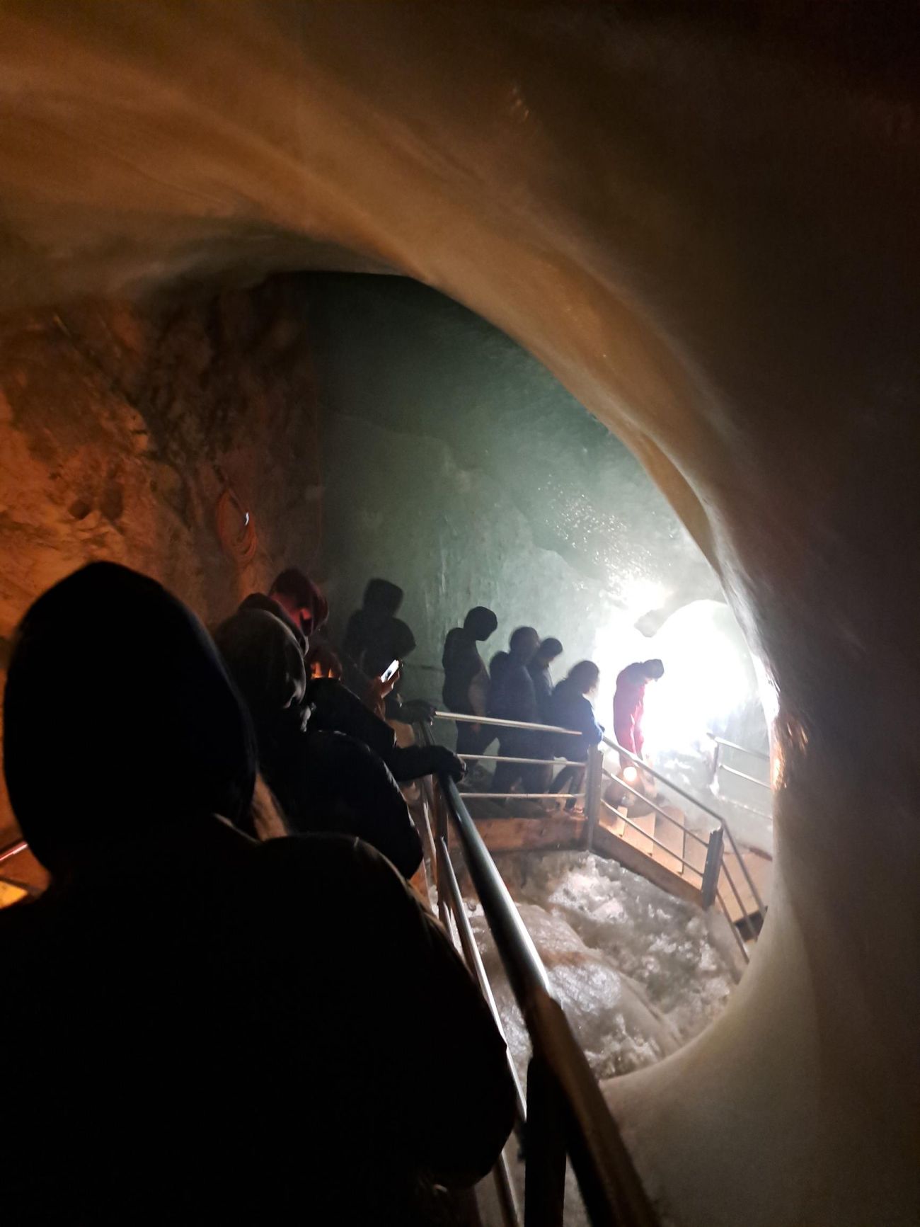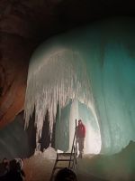 Am zweiten Tag stand ein Ausflug ins Tennengebirge auf dem Programm. Die Anreise erfolgte mit dem Zug bis zum Bahnhof Werfen, von wo uns ein kleiner Shuttlebus in einer rasanten, gut 10-minütigen Fahrt über eine schmale Serpentinenstraße auf rund 1000m Seehöhe brachte. Der weitere Weg zur Eisriesenwelt (immerhin 600 Höhenmeter) wurde zu Fuß zurückgelegt, wobei der steilste Abschnitt mit einer kurzen Seilbahnfahrt abgekürzt werden konnte. Der mäßig starke Regen machte uns kaum zu schaffen, da der Weg mittlerweile großteils unter Lawinenverbauungen durchführt, die Fernsicht blieb jedoch aufgrund des Nebelwetters aus. In der rund 70-minütigen Führung durch die größte Eishöhle der Welt waren verschiedene Eisformationen zu bestaunen. Traditionellerweise wird die Höhle mit kleinen Lämpchen mit offenem Feuer erkundet, auf elektrische Beleuchtung wird gänzlich verzichtet.  Der Aufstieg erfolgt über 700 Stufen, die man dann natürlich auch wieder hinabsteigen muss. So wurde wenigstens jedem warm, trotz der eisigen Temperaturen in der Höhle von knapp über 0°C. Zwischendurch wurde dem Führer auch noch ein Geburtstagsständchen gesungen – erlebt man auch nicht alle Tage. Auf dem Rückweg wurde noch bei einer Jausenstation ein Päuschen eingelegt und ein gemeinsames Mittagessen eingenommen, bevor wir den Rückweg nach Salzburg antraten.