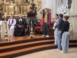 Gestaltet wurde der Gottesdienst von Prof. Perkonigg, mit Unterstützung unseres Chores – unter der Leitung von Prof. Sounble und Prof Zehetner – sowie einzelner Schülerinnen und Schüler, die durch Texte und Fürbitten zum Gelingen der Feier beitrugen. Im Mittelpunkt des Gottesdienstes stand in diesem Jahr die symbolträchtige Handlung der Fußwaschung, die Jesus am Abend vor seinem Tod an seinen Jüngern vollzog. In einer berührenden Darstellung wurde dieser Moment nachempfunden – ein Zeichen der Demut, Liebe und gelebten Nächstenliebe. Die Schülerinnen und Schüler wurden in der Ansprache von Prof. Perkonigg eingeladen, darüber nachzudenken, was es heute bedeutet, einander zu dienen und auf Augenhöhe zu begegnen.